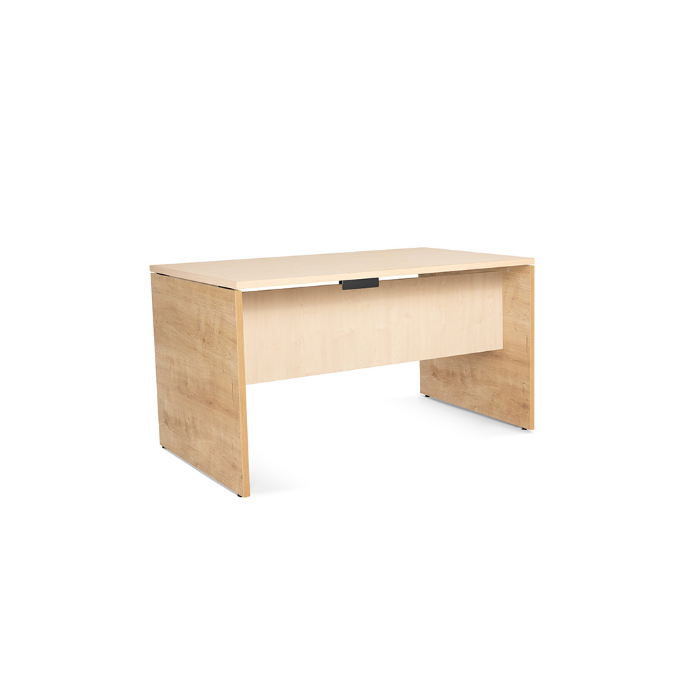 Compuesta de pies realizados en melamina de 25 mm de grosor, con canto de 1mm del mismo color, faldón en melamina de 19 mm de grosor con canto de 1mm del mismo color, y tablero de melamina de 25 mm de grosor con canto de 1mm de grosor del mismo color. Disponible en acabados Haya, Gris, Blanco y Roble. Incluye niveladores de regulación en altura de hasta 2 cm.