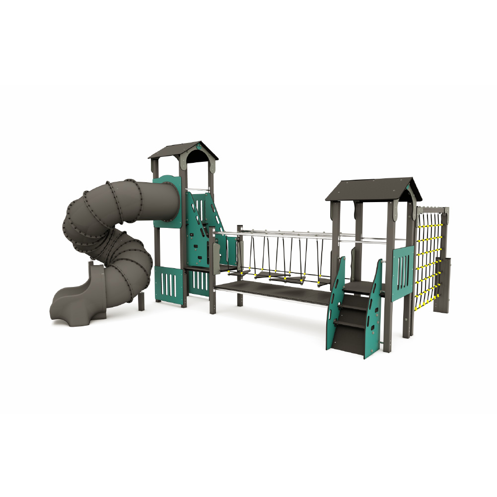 Conjunto formado por una torre con plataforma de 100x100cm con cubierta a dos aguas. Altura plataforma 1,50m. Acceso a la misma mediante escalera con paneles laterales de protección y panel trasero de la escalera cerrado. Descenso desde la torre mediante tobogán recto. Adosado a la torre se ubica una red de trepa en un lateral y un columpio de un asiento en el otro lateral.
