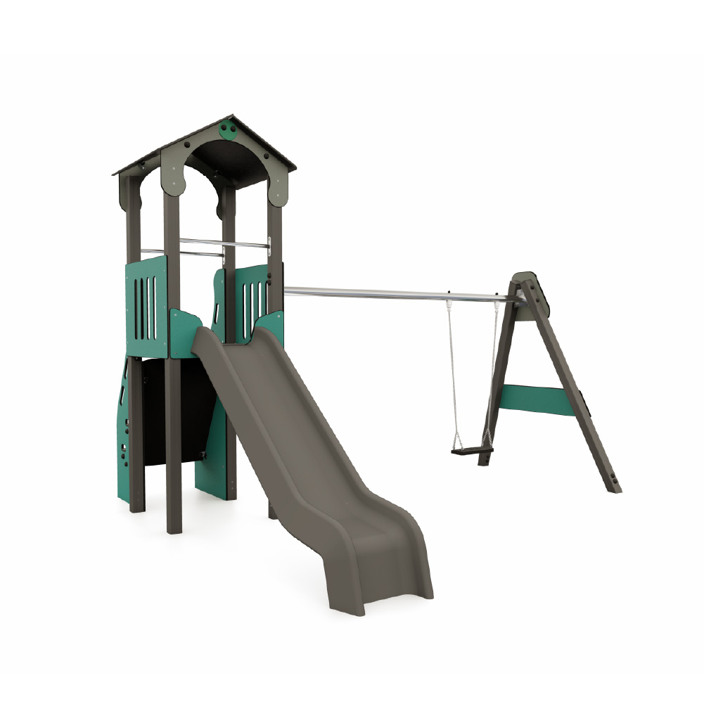 Estructura formada por una torre a dos alturas, con cubierta a dos aguas y plataforma a la que se puede acceder mediante una escalera inclinada de Polietileno de 19 mm. En la parte inferior de la torre se ubica una pequeña tienda con mostrador y banquito. En la parte superior de la torre se incluye el tobogán de deslizamiento y una pequeña cabaña con asientos.
