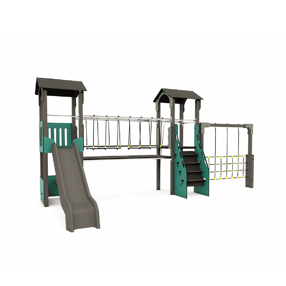 Estructura formada por una torre a dos alturas, con cubierta a dos aguas y plataforma a la que se puede acceder, bien mediante una escalera inclinada de Polietileno de 19 mm., o bien mediante un panel trepa.