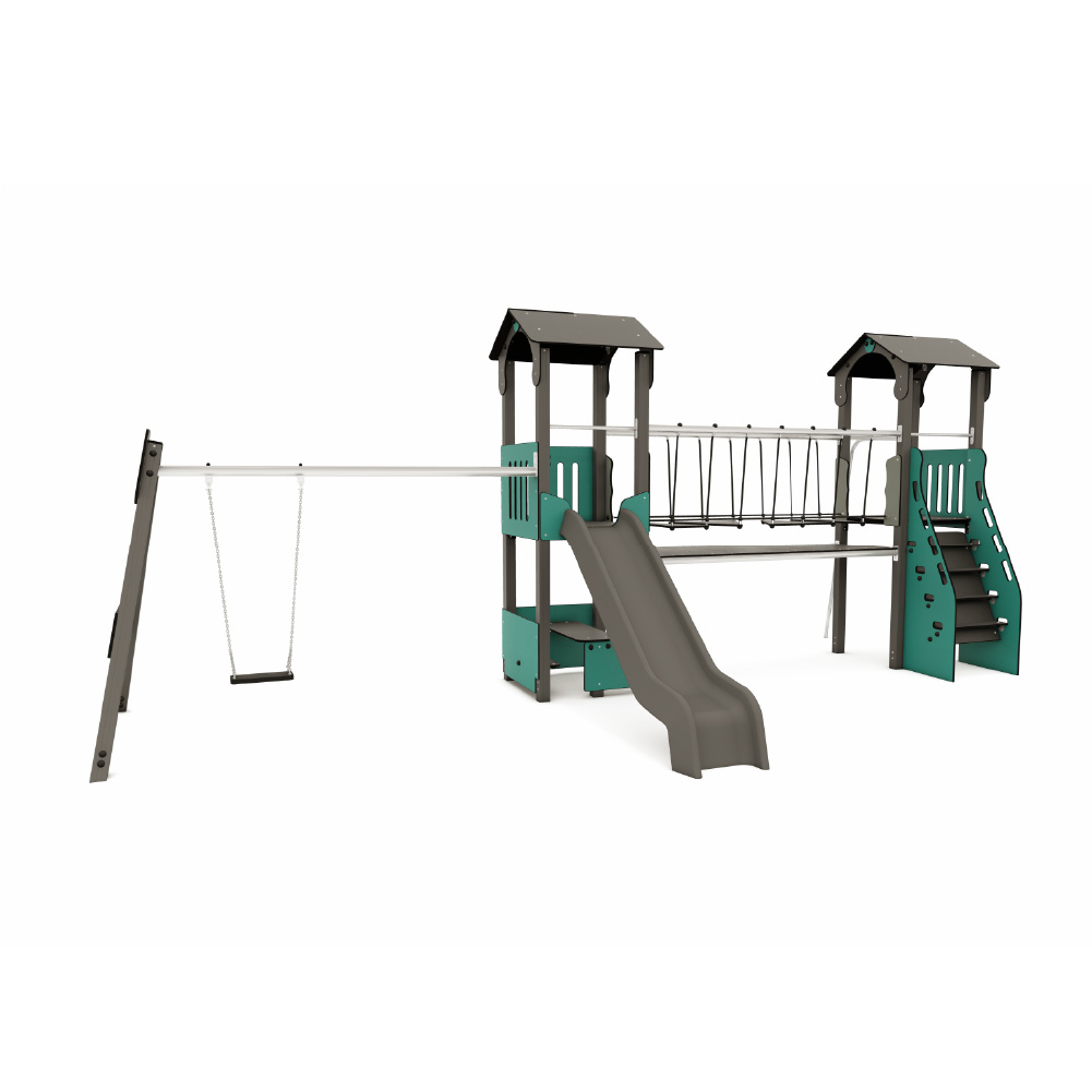Estructura formada por una torre a dos alturas, con cubierta a dos aguas y plataforma de 2,10m x 1,20m en altura 1,30m. En la parte superior de la torre se ubica una casita con asientos, simulando una cabaña, a la que se puede acceder mediante una escalera o un panel de trepa perforado y descender mediante un tobogán.
